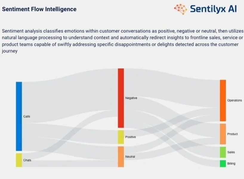 Our Sentiment Flow Intelligence maps customer journey stages to the associated emotions and sentiment detected within conversations. The Sankey chart showcases where across inquiry, service request, issue resolution, and follow-up interactions frustration and satisfaction emerge.